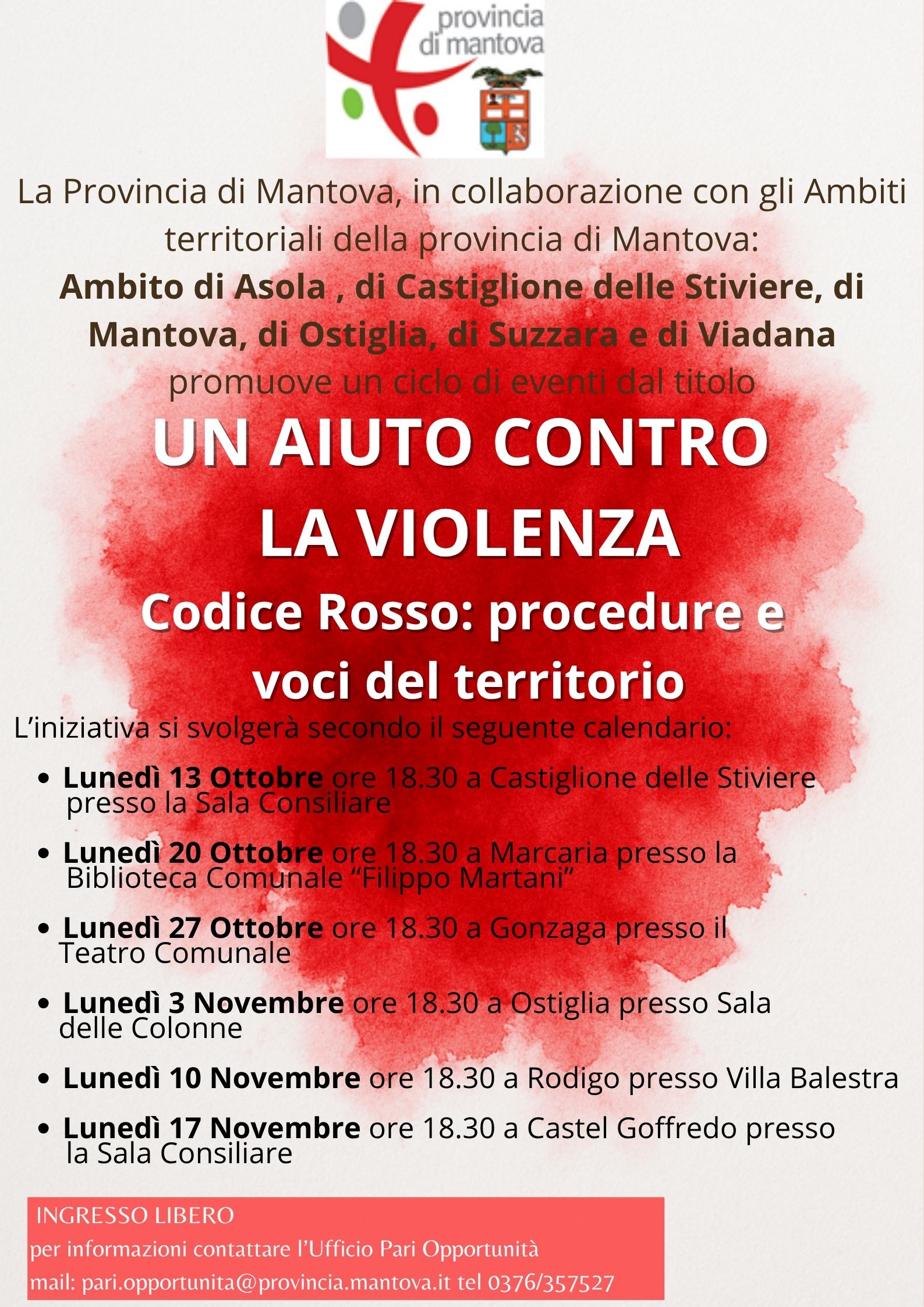 La Provincia di Mantova, in collaborazione con gli Ambiti territoriali di Asola, Castiglione delle Stiviere, Mantova, Ostiglia, Suzzara e Viadana promuove un ciclo di eventi sul tema della violenza contro le donne.